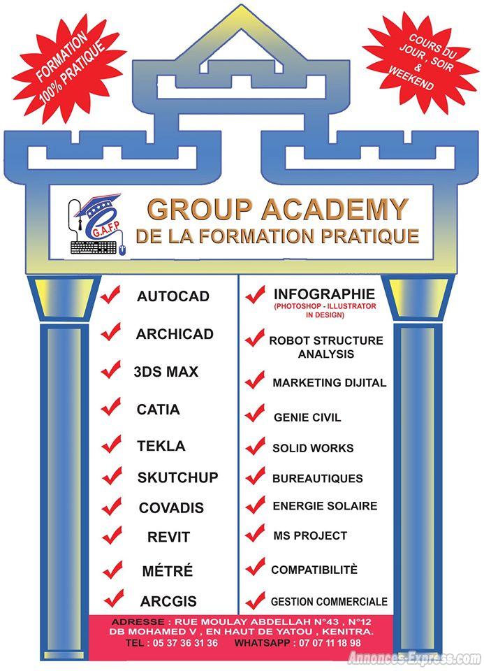 : AutoCad 2D-3D, ArchiCAD, Covadis, Catia, Solid Works, Robot Bat, Robot Structure, Photoshop, In Design, Illustrator, Infographie (In Design, Illustrator et Photoshop). التسجيل مفتوح في اليوم التكويني : تحت إشراف أساتذة متميزين